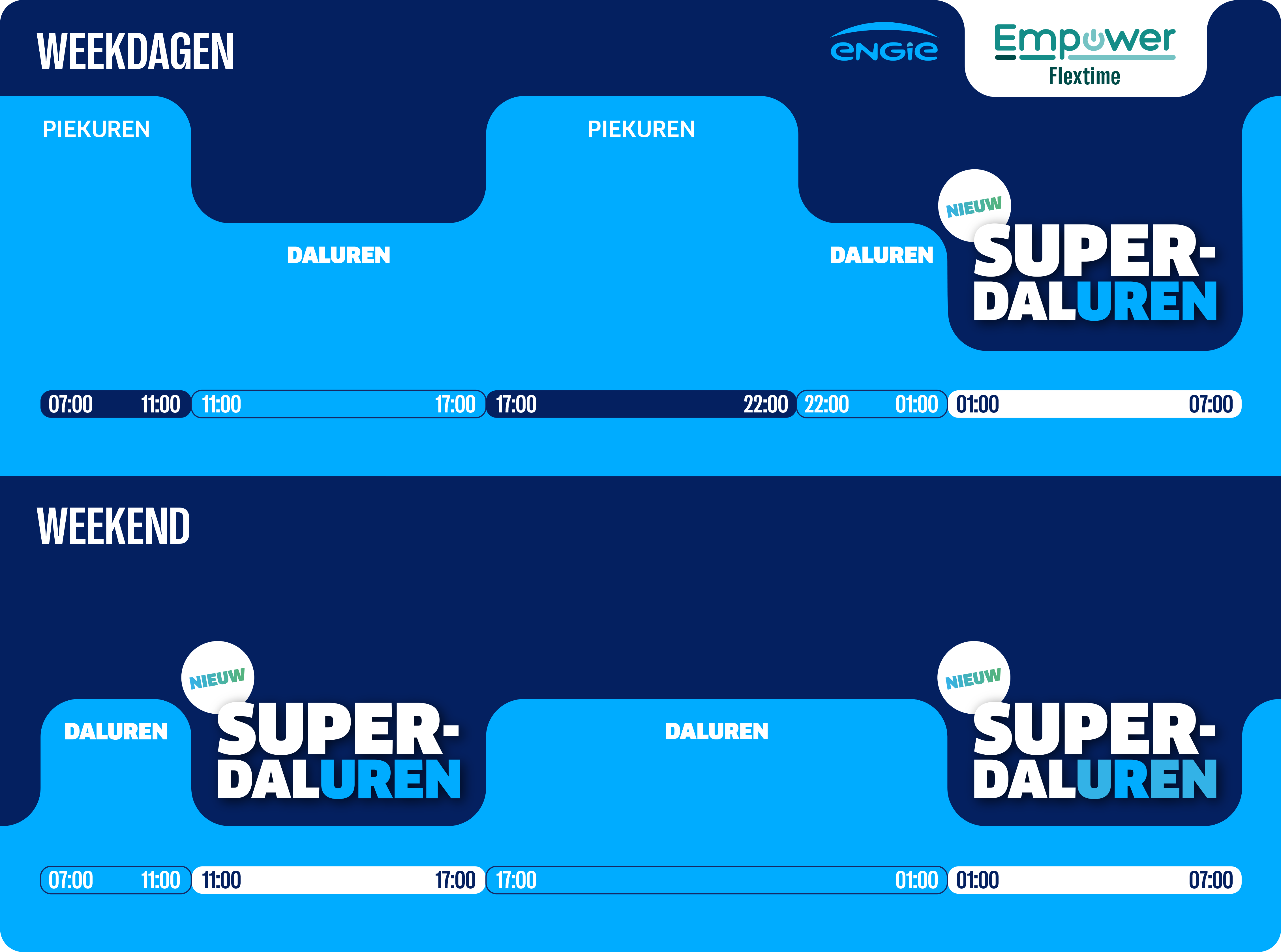 Het Empower Flextime-contract is gebaseerd op een eenvoudig principe: elektriciteit verbruiken op het juiste moment. Dankzij dit contract kunnen huishoudens hun verbruik spreiden over drie tijdsblokken: de piekuren, de daluren en de super-daluren, waarbij die laatste de meest voordelige tarieven bieden — tot 45% goedkoper dan de piekuren. Door hun verbruik in deze periodes te plannen, bijvoorbeeld het opladen van een elektrische auto of een thuisbatterij, kunnen klanten hun factuur aanzienlijk verlagen en tegelijkertijd bijdragen aan het evenwicht van het net.